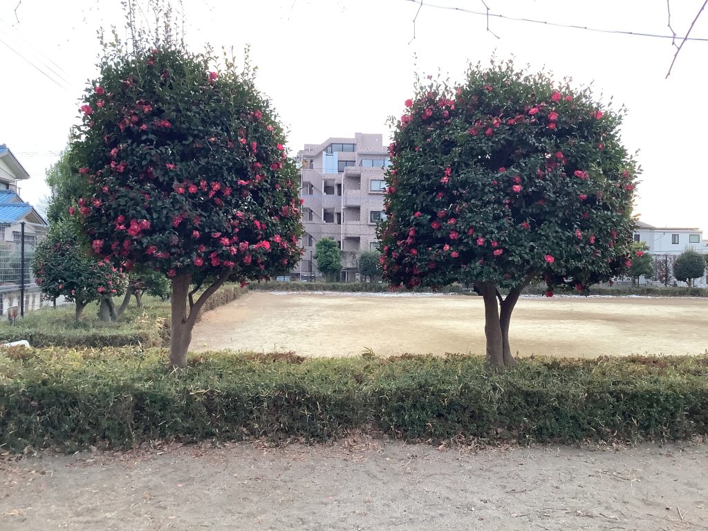 訪問途中の公園でよく見かけるのが冬に咲くツバキ科の寒椿。
